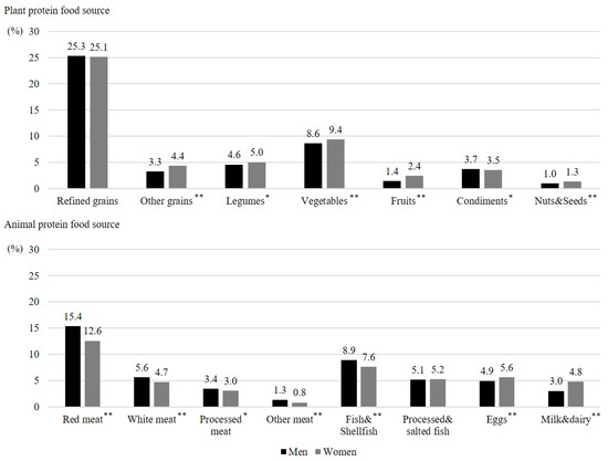 The proportion of protein intake from plant and animal food sources among total protein intake by each food group in Korean adults aged 30–64 years. p-values derived from Student’s t-test represent differences between men and women (* p < 0.05, ** p < 0.001).