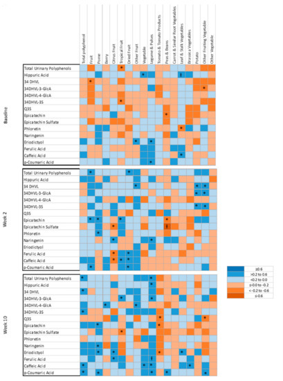 Correlations were further explored to evaluate relationships between dietary polyphenol intakes and individual urinary polyphenol metabolites (Figure 3, Supplementary Table S4). Figure 3 displays the correlations between average dietary total, vegetable and fruit sub-group polyphenols (n = 18) and the individual urinary polyphenol metabolites (n = 13) explored, of which 60 were significant. Of note, there were nine significant correlations between dietary intake polyphenols and urinary polyphenol metabolites at baseline, 24 at week 2 and 27 at week 10. Consistent correlations were observed between several individual polyphenol metabolites and polyphenol intakes. Epicatechin sulphate and peas and beans polyphenols (rs = −0.27 to −0.65) were moderate to strongly, negatively correlated. Eriodictyol was weakly to moderately correlated with total polyphenol intakes (rs = 0.10–0.24), pome fruit polyphenols (rs = 0.16–0.36) and legume and pulse polyphenols (rs = 0.25–0.38). Urinary caffeic acid was consistently correlated with total dietary polyphenol intakes (rs = 0.29–0.46).