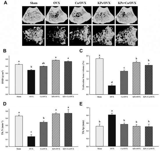 The effects of KPs on BMD and bone structure were examined by μ-CT. The OVX mice without treatment showed severe losses of trabecular bones, and mild attenuations in the thickness of the cortical bones, compared with the sham mice (Figure 2A). Although the administration of Ca alone conferred a slight protection from large-scale bone loss, larger spaces or a less-dense structure still appeared in the trabecular bones in the OVX mice receiving Ca alone. The OVX mice receiving the treatments of KPs and KPs + Ca exhibited trabecular bones with a healthy or dense appearance compared with the sham mice, suggesting that KPs or KPs combined with Ca can provide better protection than Ca alone.