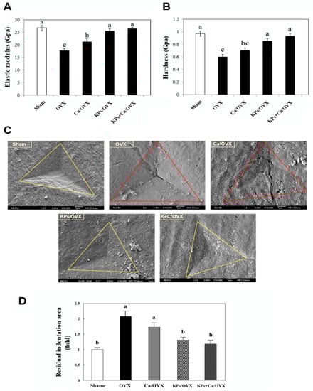 Nanoindentation analysis of the mechanical properties of cortical femoral bones at the end of oral administration. Each sample was analyzed by at least three series of outer-to-inner indentation tests (15 points) across the transverse section of the cortical bone shell (130–160 µm in thickness). The mechanical properties of the elastic modulus (A) and hardness (B) were compared among the groups. (C) The indented surfaces were further examined by scanning electron microscopy. The residual nanoindentation areas are marked by triangles and were quantitated using ImageJ software. The relative residual nanoindentation areas were calculated by comparison with the sham group (D). The data are presented as means ± SEM (n = 6). Statistical analysis was performed by one-way ANOVA and Duncan’s post hoc test, and statistical significances are indicated by different letters (p < 0.05).