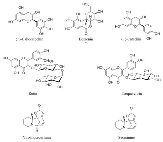 High purity reference standards were purchased, namely: (+)-gallocatechin 99.5% from Shanghai Sunny Biotech Co., Ltd. (Shanghai, China), bergenin 99.4% and rutin 95.0% from Merck KGaA (Darmstadt, Germany); (+)-catechin 99.3% and isoquercitrin 99.2% from Biopurify Phytochemicals (Chengdu, China); viroallosecurine 99.0% from ChemNorm Biotech Co., Ltd. (Wuhan, China); and securinine 98.0% from ChemFaces Biochemical Co., Ltd. (Wuhan, China); and securinine (98.0%) was purchased from ChemFaces Biochemical Co., Ltd. (Wuhan, China), respectively. Chemical structures of these reference standard components are shown in Figure 1. High-performance liquid chromatography (HPLC)-grade solvents (methanol, acetonitrile and water) and ACS (American Chemical Society) reagent, ammonium acetate (99.2%) for chromatographic separation and analysis were purchased from J. T. Baker (Phillipsburg, NJ, USA) and Merck KGaA (Darmstadt, Germany), respectively. HPLC analysis for the comparison of the 7 marker components in leaves of Securinega suffruticosa was performed using a Shimadzu Prominence LC-20A Series (Kyoto, Japan) consisting of a solvent delivery unit (LC-20AT), online degasser (DGU-20A3), column oven (CTO-20A), auto sample injector (SIL-20AC), photodiode array (PDA) detector (SPD-M20A) and LCSolution software (Version 1.24, SP1, Kyoto, Japan). The 7 reference standards were separated using a Waters SunFireTM C18 analytical column (4.6 × 250 mm, 5 μm; Torrance, CA, USA) maintained at 30 °C and two mobile phases consisting of 20 mM ammonium acetate(A) and acetonitrile (B). The gradient flow of these mobile phases is as follows: 0–20 min, 2–5% B; 20–25 min, 50% B; 25–30 min, 50–2% B; 30–40 min, 2% B. The flow rate of the mobile phase was 1.0 mL/min and injected volume of standard and test solution was 10 μL, respectively. For the quantitative analysis of the 7 reference standards in leaves and twigs of Securinega suffruticosa, each test solution of 10.0 mg of leaves and twigs extracts of Securinega suffruticosa was dissolved in 10 mL of 70% methanol and ultrasonically extracted for 60 min, respectively. All assay samples were filtered through a 0.2 μm membrane filter (Pall Life Sciences, Ann Arbor, MI, USA) and then injected into the HPLC instrument. Each standard solution of the 7 marker components was prepared at 1000 μg/mL using methanol and then refrigerated.