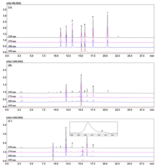 HPLC (High performance liquid chromatography) chromatograms of the standard solution (A), leaves (B) and twigs (C) of Securinega suffruticosa. (+)-Gallocatechin (1), bergenin (2), (+)-catechin (3), rutin (4), isoquercitrin (5), viroallosecurinine (6) and securinine (7).