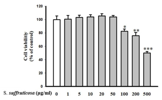 Effect of Securinega suffruticosa on cell viability of human umbilical vein endothelial cells (HUVECs). Cells were treated with leaf extract of Securinega suffruticosa (0–500 μg/mL) for 24 h. The data are expressed as a percentage of basal value and are the means ± S.E. of five independent experiments with four dishes. * p < 0.05, ** p < 0.01, *** p < 0.001 versus control.