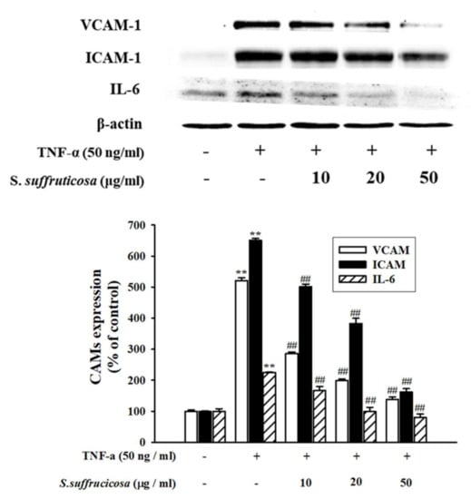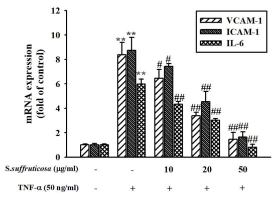 The effect of Securinega suffruticosa on the expression of the cell adhesion molecules in HUVEC was confirmed by performing Western blot analysis. Securinega suffruticosa significantly inhibited the TNF-α-induced VCAM-1, ICAM-1 and IL-6 expressions (p < 0.05) (Figure 4). In addition, real-time RT-qPCR analysis was performed in the presence of TNF-α or without Securinega suffruticosa to confirm whether Securinega suffruticosa inhibits VCAM-1 production at the mRNA expression levels. As shown in Figure 5, TNF-α-induced obvious increasing of VCAM-1, ICAM-1 and IL-6 mRNA expressions, whereas pretreatment with Securinega suffruticosa (10–50 µg/mL) was markedly decreased VCAM-1 mRNA expressions in a dose-dependent manner respectively.