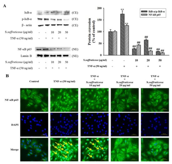 Effects of Securinega suffruticosa on TNF-α-induced NF-κB p65 expression. The nuclear protein extract (NE) and cytoplasmic protein extract (CE) were prepared and separated on 10% SDS (Sodium dodecyl sulfate)-PAGE (Polyacrylamide gel electrophoresis) and blotted with the antibodies specific for IκB-α, p-IκB-α and NF-κB p65 (A). Immunostaining of NF-κB p65 by using a monoclonal antibody (green), nuclei stained with DAPI (blue) and composite images generated by superimposing photographs. Each photograph is representative of the results from five independent experiments (original magnification ×400) (B). ** p < 0.01 vs. control, ## p < 0.01 versus. TNF-α alone.