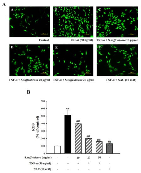 Inhibitory effect of Securinega suffruticosa on TNF-α-induced reactive oxygen species (ROS) production. ROS production was examined via fluorescence microscopy (original magnification ×100) (A). ROS production was expressed as mean ** p < 0.01 versus control, ## p < 0.01 versus TNF-α alone (B).