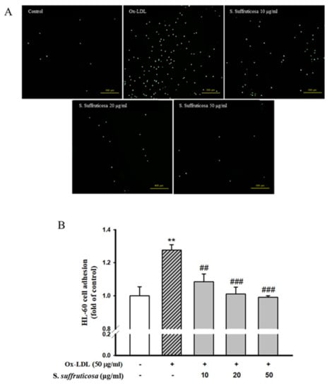 Effect of Securinega suffruticosa on adhesion of monocyte to Ox-LDL-stimulated HUVEC. (A) Adherent HL-60 cells visualized using fluorescence microscopy. (B) The intensity of fluorescence was measured using a spectrofluorometer. Data are presented as mean ± S.E. of five independent experiments with triplicate dishes. ** p < 0.01 vs. control, ## p < 0.01, ### p < 0.001 vs. Ox-LDL alone.