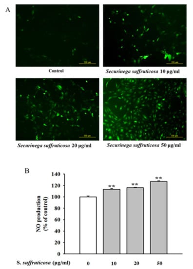 Effect of Securinega suffruticosa on nitrite production. (A) NO production was examined via fluorescence microscopy (original magnification ×100). (B) Effect of Securinega suffruticosa on NO production assayed as its stable reaction product nitrite with the Griess reaction. ** p < 0.01 vs. control.