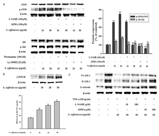This study was investigated to confirm the effect of Securinega suffruticosa on the expressions of some phosphorylated proteins which is linked with eNOS coupling such as p-endothelial cell nitric oxide synthase (p-eNOS, p-NOS3) and p-Akt in endothelial cells. For the dose-dependent experiment, endothelial cells were treated with different doses of Securinega suffruticosa for 30 min and harvested for western blot analysis. In addition, L-NAME (N(ω)-nitro-L-arginine methyl ester) and ADMA as inhibitor of NOS3 and LY294002 and wortmannin as inhibitor of Akt each were treated. As shown in Figure 10A, the expressions of phosphorylated eNOS and Akt increased in dose-dependent manner, compared to the total forms of the respective proteins. These results suggest that Securinega suffruticosa stimulates p-eNOS and p-Akt expression in HUVECs. Figure 10B shows that Securinega suffruticosa treatment dose-dependently increased the expression of GTPCH and the production of BH4 in HUVECs. In order to investigate the relationship between NO production and inflammation, cell adhesion molecule protein expressions were measured after treated with inhibitors of eNOS pathway such as L-NAME (N(ω)-nitro-L-arginine methyl ester) and. As shown in Figure 10C, the decreasing of expressions of cell adhesion molecules were inhibited by each inhibitor.