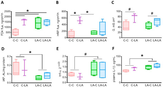 Impact of maternal and weaning LA-diets on large intestine barrier function and systemic inflammation at 3 months of age. Permeability to small (A) or large probes (B), tissue conductance (C) of the cecum, colonic intestinal alkaline phosphatase (IAP) activity (D) and tumor necrosis-α (tnf-α) mRNA levels (E) and plasma interleukin (IL)-1β concentrations (F) were determined in C-C, C-LA, LA-C and LA-LA rats at 3 months of age. Two-way ANOVA were performed to test the maternal, weaning and interaction effects. * p ≤ 0.05, # p ≤ 0.08, n = 4/group, except C-LA, where n = 3. LA: linoleic acid, C: control, FD4: FITC-dextran 4000, HRP: Horseradish Peroxidase, G: tissue conductance.