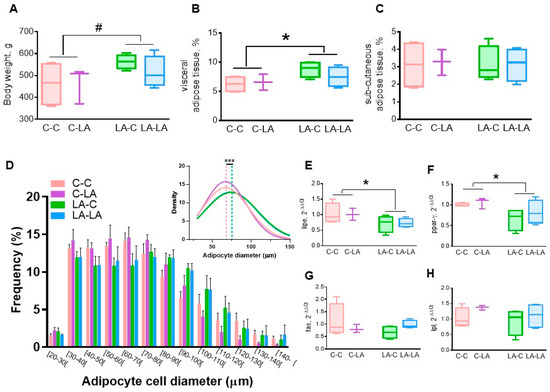 Impact of maternal and weaning LA-diets on adipose tissue physiology at 3 months of age. Body weight (A), visceral adiposity (B) and sub-cutaneous adiposity (C) were determined in CC, C-LA, LA-C and LA-LA rats at 3 months of age. Distribution of adipocyte diameters (D, insert represents the mean adipocyte diameter), hormone-sensitive lipase (lipe, E), peroxisome proliferator-activated receptor-γ (ppar-γ, F), fatty acid synthase (fas, G), and lipoprotein lipase (lpl, H) mRNA levels were determined in the epididymal adipose tissue. Two-way ANOVAs were performed to test the maternal, weaning and interaction effects. * p ≤ 0.05, # p ≤ 0.08, n = 4/group, except C-LA, where n = 3. LA: linoleic acid, C: control. ###: significant difference (p ≤ 0.05) between curve peaks.