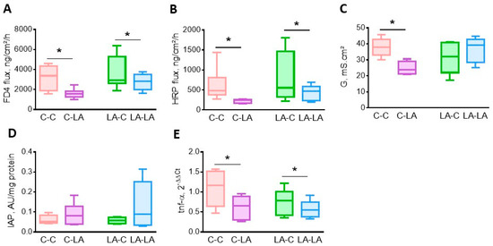 At 6 months of age, no maternal diet effect was observed on cecal barrier function or inflammation. However, the weaning diet affected cecal homeostasis—FD-4 (Figure 3A) and HRP (Figure 3B) fluxes across the cecal mucosa were decreased in weaning LA-diet-fed rats, irrespective of the maternal diet (weaning diet p = 0.01 and 0.04, respectively). Cecal conductance was decreased by the weaning LA-diet in rats born to C mothers only (weaning x maternal diet p = 0.03, Figure 3C). The activity of IAP tended to be greater (weaning diet p = 0.07, Figure 3D), while the colonic tnf-α mRNA level was reduced (weaning diet p = 0.03, respectively Figure 3E) in rats fed the weaning LA-diet, irrespective of their maternal diet. Plasma IL-1β concentration was lower in rats fed the weaning LA-diet, irrespective of the maternal diet (data not shown, published in Marchix et al., 2020 [50]).
