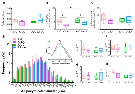 Compared to 3-month-old rats, the weaning LA-diet rather than the maternal LA-diet affected adipose tissue physiology in older offspring. The weaning LA-diet did not significantly impact rat body weight (Figure 4A), however it decreased the visceral adiposity (weaning diet p = 0.003, Figure 4B) but not the subcutaneous one (Figure 4C). A slight maternal diet effect was still observed for visceral adiposity, which was greater in rats born to LA mothers (maternal diet p = 0.04, Figure 4B). Furthermore, the comparison of the means of the Gaussian curve fits of the adipocyte distribution showed the long-lasting effect of maternal LA-diet, with a higher frequency of greater adipocyte in LA-LA offspring compared to the C-LA ones (p < 0.01, Figure 4D). The lipid metabolism key enzyme expression in the epididymal adipose tissue was not affected by the diet (Figure 4E–H).