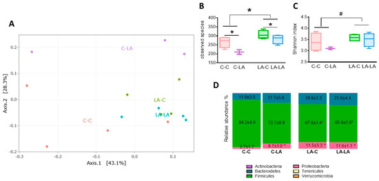 Impact of maternal and weaning LA-diets on microbiota composition at 3 months of age. Cecal microbiota composition of C-C, C-LA, LA-C and LA-LA rats was determined at 3 months of age through 16S rRNA gene sequencing. A. Principal coordinates analysis based on weighted Unifrac distances. B. Microbiota richness (observed operational taxonomic unit (OTU). C. Microbiota diversity estimated by the Shannon index. D. Main phyla relative abundance (mean ± SEM). Two-way ANOVAs were performed to test the maternal, weaning and interaction effects. Panels B–C: * indicates significant effect (p ≤ 0.05), # indicates a trend for significance (p ≤ 0.07), Panel D: * indicates maternal diet effect (p ≤ 0.05) n = 4/group, except C-LA, where n = 3. LA: linoleic acid, C: control, SEM: standard error of the mean.