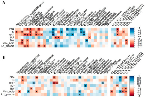 Correlations between family relative abundances and conjugated linoleic acid (CLA)s, and rat phenotype key parameters. Spearman rank correlations were performed at 3 months (A) and 6 months (B) of age between family relative abundances or CLAs and gut barrier, adiposity and systemic inflammation parameters, and represented as a correlation matrix between parameters. * p < 0.05, # p < 0.06. FD4: FITC-dextran 4000, G: tissue conductance, HRP: horseradish peroxidase, IAP: intestinal alkaline phosphatase, Visc_Adip: visceral adiposity, BW: body weight.