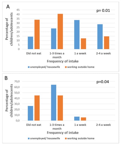Frequency of intake (expressed as percentage of children/adolescents in the sample) for lean fish (A) and fatty fish (B) in children/adolescents whose mothers are unemployed /housewife or work outside home.