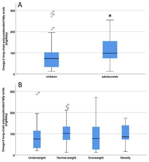 Estimation of omega-3 long chain polyunsaturated fatty acids (LC-PUFA) intake from fish/seafood in children and adolescent (A) and body weight categories (B). The significant difference in Panel A is indicated by the asterisk * p < 0.05. ° indicate outliers defined as a data points located outside the whiskers of the box plot.