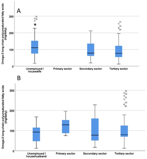 Estimation of omega-3 long chain polyunsaturated fatty acids (LC-PUFA) intake from fish/seafood in children/adolescents based on the mother’s work (A) and father’s work (B). The significant difference in Panel A is indicated by the asterisk * p < 0.05. ° indicate outliers defined as a data points located outside the whiskers of the box plot.
