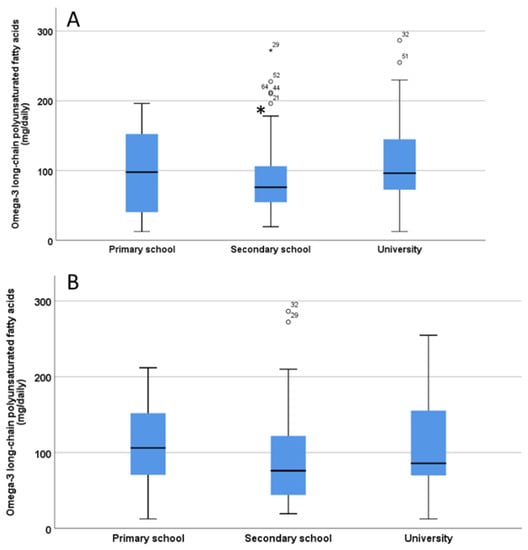 No significant differences (p = 0.90) were found in the O3 intake of children/adolescents between children living with one parent and those living with both parents. There were significant differences in the O3 intake of children/adolescents based on the mother’s educational level (p = 0.03), as children whose mothers had completed secondary school education had a lower intake of O3 (Figure 4A), while in contrast no significant differences (p = 0.19) regarding fathers’ educational level were found (Figure 4B).