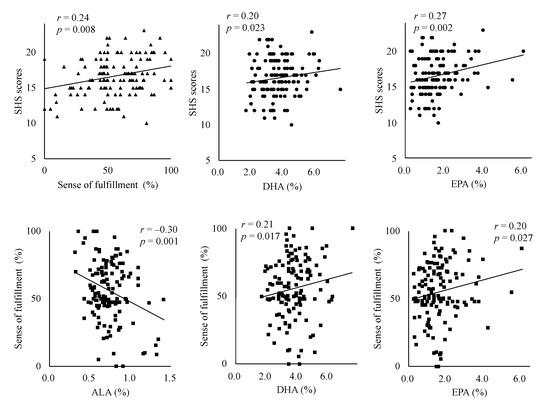 The SHS scores were significantly positively correlated with fulfillment, DHA% and EPA% (p = 0.008, p = 0.023 and p = 0.002, respectively). A sense of fulfillment showed significantly positive correlations with the concentrations of DHA% and EPA% (p = 0.017 and 0.27, respectively), whereas a sense of fulfillment showed a significant negative correlation with ALA (p = 0.001). These significant correlations are shown in Figure 1.