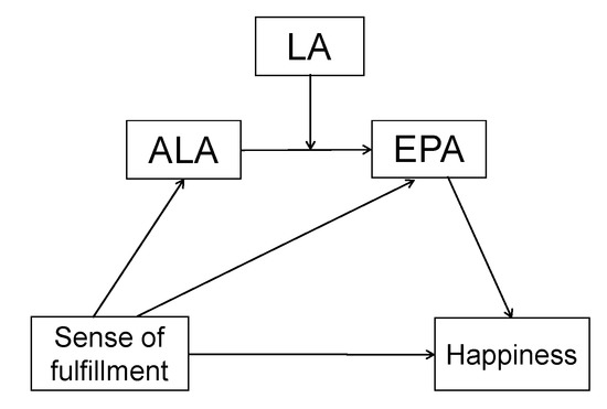 Figure 2 shows a hypothetical mediation model, generated using the mediation model 91 [36]. We developed this mediation model because ALA and a sense of fulfillment were inversely related with each other, because EPA was positively correlated with a sense of fulfillment and happiness, and because ALA can be converted into EPA in the presence of LA [37]. Age, BMI, menopause, and snacking habits were adjusted as covariates in the analysis.