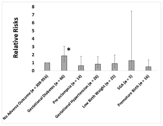 Relative risks of various adverse conditions of pregnancy in women who supplemented their diets with multiple micronutrients in pregnancy (* p < 0.05).