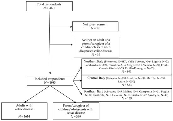 We received a total of 2021 responses; 19 (0.9%) subjects did not give their consent to the interview, and 17 (0.8%) were excluded because they declared not to be either adults with a certified diagnosis of CD or parents/caregivers of children/adolescents with CD. Therefore, 1983 responses were analyzed. Out of them, 1614 (81.4%) were filled in by adults with CD and 369 (18.6%) by parents/caregivers of children/adolescents with CD. The flow diagram of the survey is shown in Figure 1.