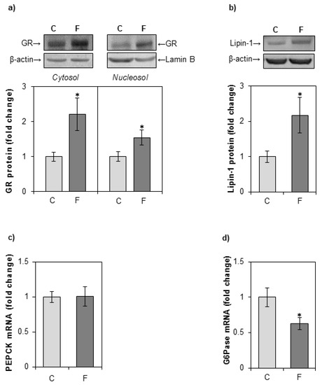 The effects of a fructose-rich diet on the level of GR, lipin-1 PEPCK, and G6Pase in the liver. Groups: control (C), fructose-fed (F). (a) GR protein level in hepatic cytosols and nucleosols, and (b) lipin-1 protein level in hepatic whole cell extracts, were measured by Western blot. Relative integrated optical density of the immunoreactive bands was assessed by ImageQuant software, normalized to equal load controls and expressed as fold of the control. The levels of PEPCK (c) and G6Pase (d) mRNA were determined by qPCR and expressed as fold of the control. The values represent the means ± SEM (n = 9). Statistical significance of differences between experimental groups: * p < 0.05.