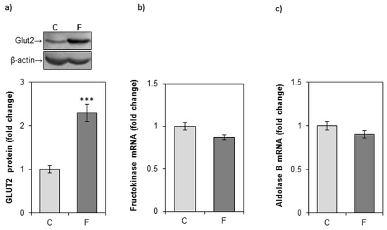 The effects of a fructose-rich diet on the level of GLUT2, fructokinase, and aldolase B in the liver. Groups: control (C), fructose-fed (F). (a) GLUT2 protein level in the hepatic whole cell extracts was measured by immunoblotting. Relative integrated optical density of the immunoreactive bands corresponding to GLUT2 was assessed by ImageQuant software, normalized to β-actin, and expressed as fold of the control. Representative Western blot is shown. The level of fructokinase (b) and aldolase B (c) mRNA relative to β-actin mRNA was determined by SYBR Green real-time PCR and expressed as fold of the control. The values represent the means ± SEM (n = 9). Statistical significance (Student’s t-test) of differences between experimental groups: *** p < 0.001.