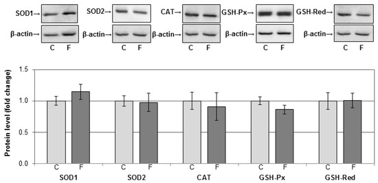 The effects of a fructose-rich diet on the level of antioxidant enzymes in the liver. Hepatic whole cell extracts (50 µg protein) were subjected to SDS-PAGE and Western blotting. Relative integrated optical density was assessed by ImageQuant software. β-actin was used as loading control. Representative Western blots and relative quantification of antioxidant enzyme protein levels of control (C) and fructose-fed rats (F) are shown. Values are means ± SEM (n = 9) and are presented as fold of the control. SOD1, cytoplasmic copper-zinc superoxide dismutase; SOD2, mitochondrial manganese superoxide dismutase: CAT, catalase; GSH-Px, glutathione peroxidase; GSH-Red, glutathione reductase.