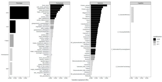 To determine how the different environmental variables impact the microbiota, we first calculated their simple effects (i.e., the effect of the environmental variable on the microbiota without any other covariates). As previously described in the methods, the dietary intervention had no significant effect on microbiota composition (p = 1.0, R2 = 0.08%). A total of 41 variables, existing of phenotypical characteristics, food groups and nutrients, significantly correlated to GI microbiota composition as shown in Figure 1. The largest proportion of GI microbiota variation was explained by individuals (R2 = 40.0%) (Supplementary Figure S1). The phenotypical characteristics BMI (R2 = 0.73%) and sex (R2 = 0.22%) were both correlated with microbiota composition. BMI explained the largest proportion of microbiota variation out of all microbiota covariates. With respect to the dietary variables, 29 nutrients and 10 food groups were significantly correlated with GI microbiota composition. Concerning the food groups, fresh fruits explained the highest proportion of variation in GI microbiota composition (R2 = 0.51%). Further zooming in on the fresh fruits showed that berries and grapes were the fruits most contributing to this observation. Other significant food groups were nuts, seeds and peanuts (R2 = 0.45%), grain products (R2 = 0.39%) and both processed and red meat (R2 = 0.36% and R2 = 0.25% respectively). Among the nutrients, total protein (R2 = 0.46%) and protein from animal (R2 = 0.62%) and plant (R2 = 0.42%) sources explained the largest proportion of variation. In addition, various forms of carbohydrates, water-soluble vitamins, minerals and omega-3 fatty acids were significantly associated to GI microbiota composition, while other fatty acids and fat-soluble vitamins did not. None of the cognitive functioning domains was significantly correlated with GI microbiota composition.