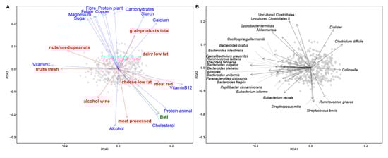 Association of microbiota with food groups, nutrients and BMI. Samples are plotted as grey circles. (A) Redundancy analysis (RDA) bi-plot of microbiota with explanatory variables; food groups (red), nutrients (blue) and phenotypical characteristics (green). (B) RDA bi-plot of samples with the associated microbial taxa (indicated as genera or species-level groups) The direction of the arrows depicts the abundance of microbial taxa. Length of the arrows is a measure of fit. The variable arrows approximate the correlation between species and explanatory variables. Samples near the coordinate origin (zero point) suggest near zero correlation. The further a sample falls in the direction indicated by the arrow, the higher the correlation.