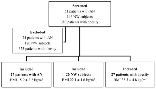 After screening, 80 patients were enrolled: 27 affected by AN (weight stable for at least 1 month before the study), 26 NW and 27 affected by obesity.