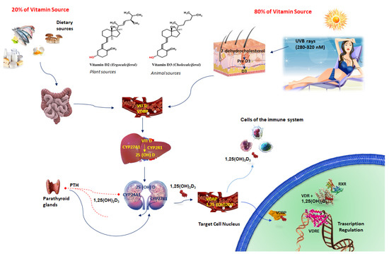 Vitamin D3 (1,25(OH)2D3) is a fat-soluble steroid with endocrine function. In addition to its conventional role in calcium homeostasis, it exerts other biological effects, such as regulation of cell proliferation, differentiation, and apoptosis, in numerous cell types and tissues. The two major forms of vitamin D, D2 (ergocalciferol) and D3 (cholecalciferol), are obtained in the skin when exposed to sunlight or, to a lesser extent, through diet and supplementation (Figure 1). VDD is a public health concern for all age groups around the world, both in industrialized countries where vitamin D is commonly integrated and in countries near the equator with remarkable UV radiation [12]. VDD may be due to limited sunlight exposure, skin pigmentation, black ethnicity, advanced age, low levels of dietary vitamin D intake, gastrointestinal malabsorption syndromes, liver and kidney diseases, obesity, diabetes mellitus, and alcohol ingestion [10]. Usually, vitamin D status is evaluated by serum 25-hydroxyvitamin D (25(OH)D) levels [13] (Figure 2).