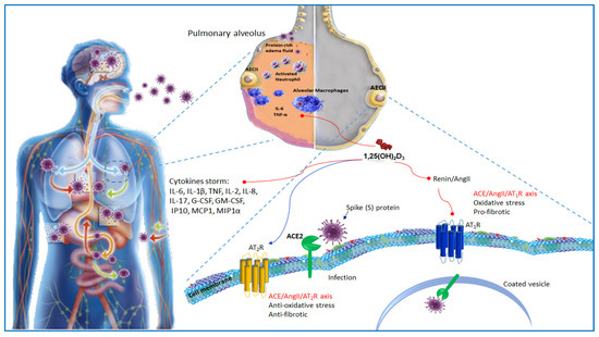Host–SARS-CoV2 interaction and Vitamin D action. SARS-CoV2 interacts with the host ACE2 receptor using a spike protein S1 that facilitates the binding of the virion to the cell. Infection generates “cytokines storm”. ACE2-expressing alveolar epithelial type II cells (AECII) help corona viral replication. 1α,25(OH)2D3 induces ACE2/Ang-(1-7) axis and inhibits renin and the ACE/Ang II/AT1R cascade, and therefore prevents vasoconstriction, inflammation, cell proliferation, fibrosis, oxidative stress, and activates autophagy. ACE, Angiotensin Converting Enzyme; Ang II, Angiotensin II; AT1R, Angiotensin type 1 receptor; AT2R, Angiotensin type 2 receptor