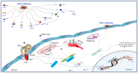 An important antiviral pathway in monocytes and macrophages takes into account the activation of TLRs [54] (Figure 4). Vitamin D metabolism in macrophages is associated with pathogen recognition [54]. In macrophages, TLRs induce upregulation of the VDR and CYP27B1 gene expression [55], initiating a signaling cascade essential to upregulate VDR and CYP27B1 which, in turn, induces the conversion of 25(OH)D to 1,25(OH)2D. This conversion could be a key phase to trigger the TLR pathway. It is well known that the binding of 1,25(OH)2D to the VDR enables expression of multitarget genes, which control the monocytes/macrophages function during infection. Macrophages internalize serum VDBP-bound 25(OH)2D3 from the extracellular fluid by endocytosis using 25(OH)2D3 as a substrate for upregulated CYP27B1. Since VDR is efficient in the presence of exogenous 1,25(OH)2D3, it can facilitate the ligation of the TLR2/1 heterodimer in macrophages and upregulated CYP27B1 [10,56]. Hence, extrarenal 1,25(OH)2D production is regulated both by TLR ligation and cytokine secretion, using a sophisticated crosstalk between different signaling pathways [56]. It is also possible that the expression of TLRs in various cell types, and the aptitude to react to a wide range of pathogens promotes additional TLRs or different PRRs to induce extrarenal expression of CYP27B1, and therefore locally synthesized 1,25(OH)2D can perform numerous actions in the immune response. The mechanism by which TLR ligation improves CYP27B1 expression involves NF-κB, JAK-STAT, and p38 MAPK pathways, and phosphorylation of the transcription factor C/EBPβ by p38 MAPK [57]. Cytokines, such as IL-1, IL-2, IL-4, IL-13, IFN-γ, and TNF-α, regulate CYP27B1 expression and vitamin D metabolism [56,57]. It is possible that the pathways involved in cytokine-regulated transcription of CYP27B1 are similar to the pathways employed by TLR ligation-induced regulation [58]. It has been demonstrated that the TLR8 ligands, CL097 and ssRNA40, induced a dose-dependent increase in CYP27B1 expression in macrophages [59,60]. In addition, 1α,25(OH)2D3 promotes TLR2 and TLR4, the receptor of interferon gamma (IFN-γ), or CD40 expression in monocytes [50], supporting a condition of hyporesponsiveness to PAMPs [10,61]. In human macrophages, following TLR2/1 stimulation, 1α,25(OH)2D3 activates innate immunity inducing antimicrobial peptides production [10]. Another interesting finding is that 1α,25(OH)2D3 regulates the TLR9-dependent production of IL-6 and increases NE/PAD4/COX-3/GAPDH, TLR7, and type I interferon (IFN) mRNA levels (Figure 4) [62]. It is possible that in individuals with adequate circulating levels of 25(OH)D, infection by SARS-CoV2 viruses following recognition by TLRs and cytokine production is able to intensify the levels of 1,25(OH)2D, which modulate the immune response to counteract the infections (Figure 4).