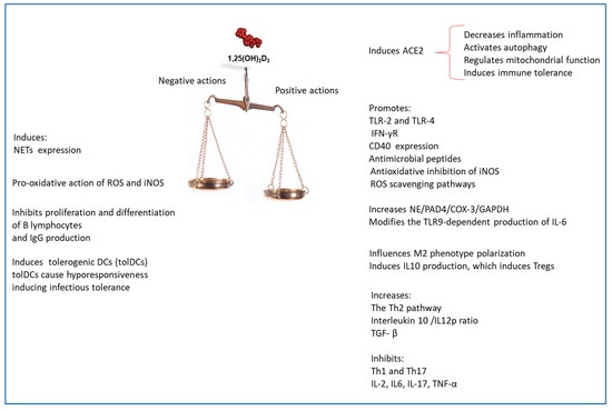 Positive and negative effects of vitamin D in immunomodulation against SARS-CoV2. DCs, Dendritic Cells; iNOS, inducible Nitric Oxide; NETs, neutrophil extracellular traps.