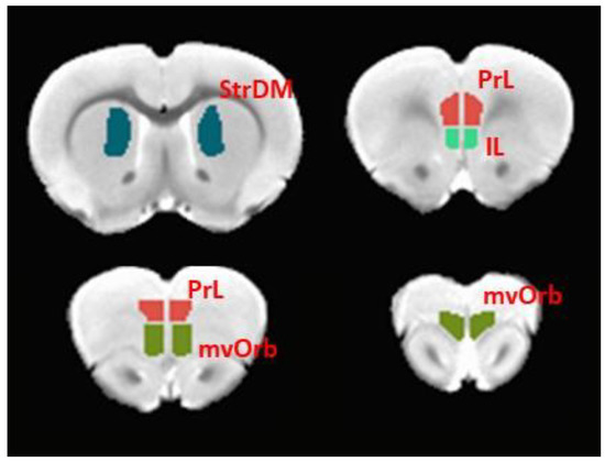 Demonstration of regions of interest for resting state functional MRI (rs-fMRI) data analysis. IL: infralimbic cortex; PrL: prelimbic cortex; mvOrb: medial-ventral orbitofrontal cortex; StrDM: dorsomedial striatum.