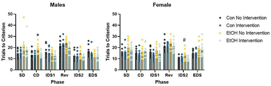 Attentional set shifting and reversal learning in adult rats. Prenatal ethanol increased the trials to criterion in some phases of the task in both males and females. The intervention, choline administration combined with working memory training, improved performance in both sexes. Analysis of males confirmed a significant phase x prenatal interaction, p = 0.017, and a significant increase in trials to criterion in the EtOH No intervention group on the compound discrimination phase (CD), Bonferroni posthoc, * p = 0.01. Analysis of females confirmed a significant effect of prenatal ethanol, p = 0.001, and postnatal treatment, p = 0.046. A significant increase in trials to criterion in the EtOH No Intervention group on the second intradimensional shift (IDS2), Bonferroni posthoc, # p = 0.054. Con = Control, EtOH = Ethanol, SD = Simple Discrimination, CD = Compound Discrimination, IDS1 = Intradimensional Shift 1, Rev = Reversal, IDS2 = Intradimensional Shift 2, EDS = Extradimensional Shift.