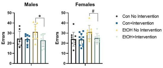 The total number of errors made during the attentional set shifting and reversal learning task in adult rats. Prenatal ethanol increased the number errors in males, p = 0.049, and females, p = 0.039. The intervention reduced errors in EtOH rats in males, * p = 0.02, and females # p = 0.03. Con=Control, EtOH=Ethanol.