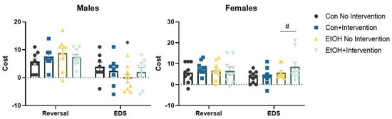 The reversal and shift cost for male and female rats. No significant effects on the reversal cost were detected. Analysis of the cost of the extradimensional shift (EDS) confirmed a main effect of sex, p = 0.002 and sex x prenatal treatment interaction, p = 0.01. Prenatal ethanol exposed male rats were less likely exhibit a positive shift cost, chi square analysis, * all p values < 0.035. The intervention significantly increased the number of rats exhibiting a shift cost. Prenatal ethanol did not change the number of females at exhibited an increased shift cost, but the cost was increased in females, regardless of the intervention, # p = 0.03. Con = Control, EtOH = Ethanol, EDS = Extradimensional Shift.