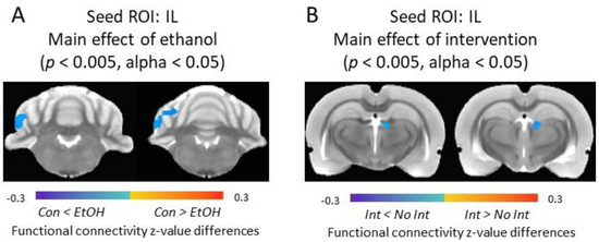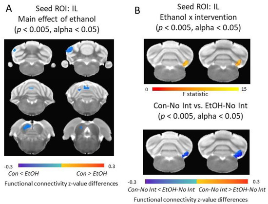 Alterations of IL functional connectivity in female rats. (A) Main effect of ethanol was detected in cerebellar areas. Color code: connectivity differences between Con and EtOH animals. (B) Main effect of intervention was detected in the habenular complex area. Color code: connectivity differences between receiving the intervention (Int) and those that did not (No Int). ROI = Region of Interest, IL = Infralimbic Cortex, Con = Control, EtOH = Ethanol.
