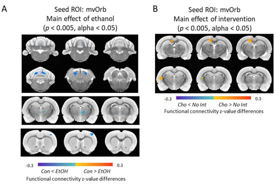 Alterations of mvOrb functional connectivity in male rats. (A) Main effect of EtOH was detected in ventral lateral/medial nucleus of thalamus, primary somatosensory cortex, the external cortex of the inferior colliculus and cerebellar areas. (B) Main effect of intervention was detected in the retrosplenial cortex and caudate putamen. Color code: connectivity differences between Control (Con) and Ethanol (EtOH) animals. ROI = Region of Interest, mvOrb = medial-ventral Orbitofrontal Cortex.