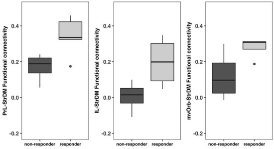 Functional connectivity differences between responders and non-responders in ethanol exposed male rats. Responders had significantly higher Prelimbic Cortex to dorsomedial Striatum (PrL-StrDM) and infralimbic to dorsomedial Striatum (IL-StrDM) functional connectivity compared to non-responders. Increased medial-ventral Orbitofronal cortext-dorsomedial Striatum (mvOrb-StrDM) functional connectivity in responders compared to non-responders was also detected. The dots represent animals outside 1.5 times the interquartile range.