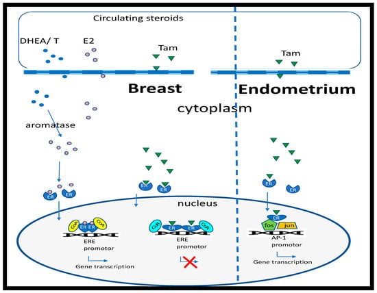 Regulation of estrogen-response genes by 17β-estradiol and tamoxifen. Estradiol (E2) (pink circles) passes through the cell membrane and binds to the estrogen receptor (ER), inducing a conformational change in shape and nuclear translocation, where it interacts with specific estrogen response elements (ERE) that regulate estrogen responsive genes, after recruiting cell-specific cofactors (CoA). E2 can be metabolized by aromatase from androgen precursors (blue circles; dehydroepiandrosterone (DHEA) or testosterone (T)). In breast cells, binding of tamoxifen (Tam) to ERs results in a conformational change that recruits corepressors (CoR) of gene transcription. However, in the endometrium, tamoxifen binding to the ER results in protein:protein interactions and activation of the activator protein 1 (AP-1) promotor.