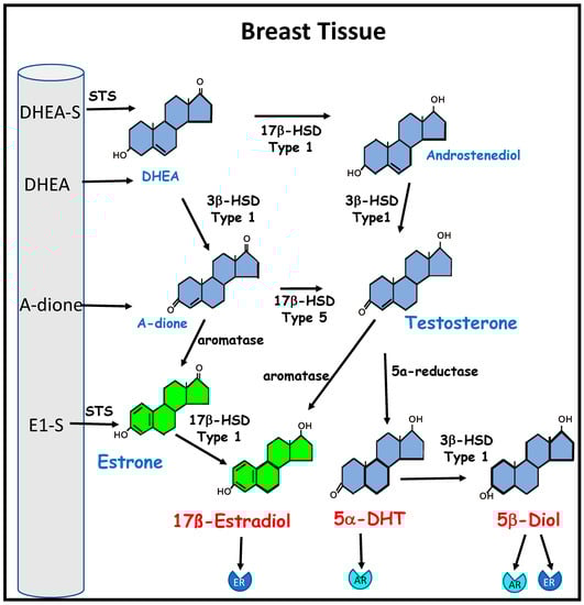 The biosynthesis of estrogen from inactive circulating precursors in breast cancer. Bioactive estrogen can be synthesized by breast cancer cells and breast stromal tissue from circulating precursor steroids. These include the adrenal androgens dehydroepiandrosterone (DHEA) and androstenedione (A-dione); dehydroepiandrosterone sulphate (DHEA-S), the major circulating androgen, and estrone sulphate (E1-S), the major circulating estrogen in postmenopausal women, which can be converted to DHEA and estrone (E1), respectively, by steroid sulfatase (STS). DHEA and androstenediol are metabolized by 3β- hydroxysteroid dehydrogenase (3β-HSD) type 1 to the estrogen precursors A-dione and testosterone. Testosterone can be metabolized by 5α-reductase to the potent androgen 5α-dihydrotestosterone (5α-DHT), which has a high affinity for the androgen receptor (AR). Type 1 3β-HSD can convert 5α-DHT to 5α-androstane-3β,17β-diol (5β-diol), which is an agonist of both the AR and the estrogen receptor (ER). Aromatase is required for the conversion of testosterone to 17β-estradiol and conversion of A-dione to E1, which can be further metabolized by 17β- hydroxysteroid dehydrogenase (17β-HSD) type 1 to 17β-estradiol, which has a high affinity for ER.