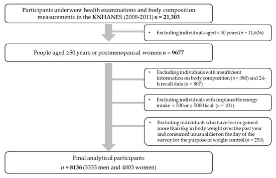 The data used in the current study were based on the 2008–2011 Korea National Health and Nutrition Examination Survey (KNHANES). The KNHANES is a cross-sectional, nationally representative survey in South Korea annually conducted by the Korea Centers for Disease Control and Prevention (KCDC). It consists of a health examination survey, health behavioral survey, and nutritional survey, and it occasionally involves body composition measurements. A flow diagram of the selection of study participants is shown in Figure 1. To date, body composition measurements were conducted between 2008 and 2011. Among participants who underwent health examinations and body composition measurements (n = 21,303), those aged ≥50 years or postmenopausal women were selected (n = 9677). Among them, we excluded those who did not have sufficient information on body composition (n = 380) and 24-h recall data (n = 807). We further excluded those with implausible energy intakes (<500 or >5000 kcal/day; n = 101) and those who had lost or gained more than 6kg in body weight over the past year and consumed an unusual diet on the day of the survey for the purpose of weight control (n = 253). Finally, a total of 8136 participants (3333 men and 4803 women) were included in this study. The present study was conducted according to the guidelines laid down in the Declaration of Helsinki. All procedures involved in the KNHANES were approved by the KCDC Institutional Review Board (IRB No: 2008-04EXP-01-C, 2009-01CON-03-2C, 2010-02CON-21-C, and 2011-02CON-06-C), and all participants provided written informed consent.