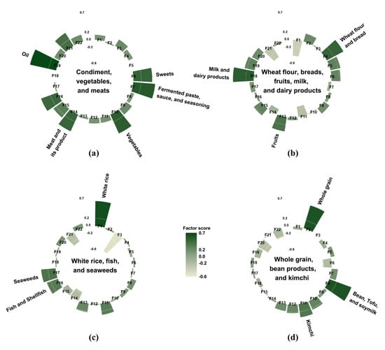 Factor loading matrix of food groups for the four dietary patterns identified from the 24-h dietary recall. (a) the “condiment, vegetables, and meats” pattern; (b) the “wheat flour, breads, fruits, milk, and dairy products” pattern; (c) the “white rice, fish, and seaweeds” pattern; and (d) the “whole grain, bean products, and kimchi” pattern. The top three food groups with the highest factor loading value were used to name each dietary pattern. As an exception, oils, fermented paste, sauce, and seasoning, and sweets were grouped into condiments and used for naming the “condiment, vegetables, and meats” pattern. F1: white rice, F2: whole grain, F3: noodles and dumpling, F4: wheat flour and bread, F5: potatoes and corn, F6: sweets, F7: fermented paste, sauce, and seasoning, F8: bean, tofu, and soymilk, F9: nuts and seeds, F10: vegetables, F11: kimchi, F12: mushroom, F13: fruits, F14: meat and its product, F15: eggs, F16: fish and shellfish, F17: seaweeds, F18: milk and dairy products, F19: oil, F20: beverage, F21: alcohol, F22: coffee and tea.