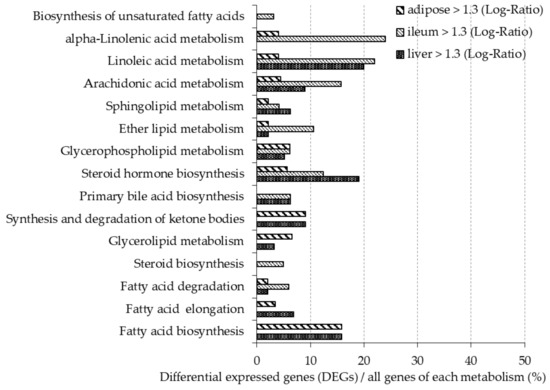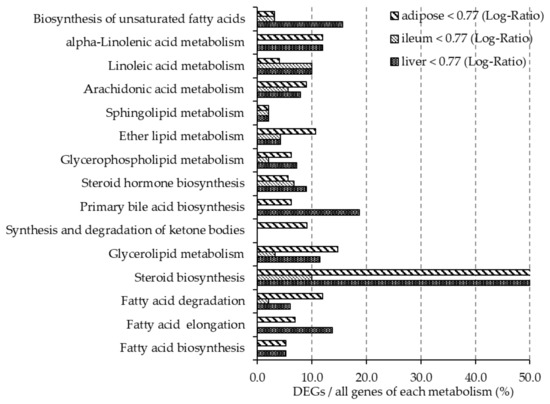 Figure 2 and Figure 3 show the ratio of DEGs to all genes involved in the lipid metabolism pathway, as described in the Kyoto Encyclopedia of Gene and Genome (KEGG) Pathway Database [28]. More than 10% of genes involved in steroid biosynthesis (mmu00140) were downregulated in all organ tissues. In the liver, more than 10% of genes involved in fatty acid elongation (mmu00062), glycerolipid metabolism (mmu00561), primary bile acid biosynthesis (mmu00120), biosynthesis of unsaturated fatty acids (mmu01040), and alpha-linolenic acid metabolism (mmu00592) were downregulated, while more than 10% of genes involved in steroid hormone biosynthesis (mmu00140), linoleic acid metabolism (mmu00591), and fatty acid biosynthesis (mmu00061) were upregulated. In adipose tissue, more than 10% of genes involved in fatty acid degradation (mmu00071), glycerolipid metabolism, ether lipid metabolism (mmu00565), and alpha-linolenic acid metabolism were downregulated, while more than 10% genes of genes involved in fatty acid biosynthesis were upregulated. In the ileum, more than 10% of genes involved in steroid hormone biosynthesis, ether lipid metabolism, arachidonic acid metabolism (mmu00590), linoleic acid metabolism, and alpha-linolenic acid metabolism were upregulated.
