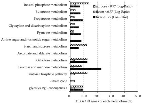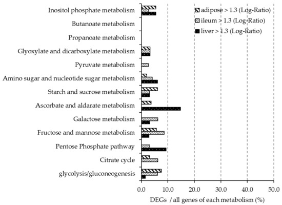 Figure 4 and Figure 5 show the ratio of DEGs to all genes involved each carbohydrate metabolism pathway, as described in the KEGG Pathway Database. In the liver, more than 10% of genes involved in ascorbate and aldarate metabolism (mmu00053) were upregulated, and more than 10% of genes involved in galactose metabolism (mmu00052) and fructose and mannose metabolism (mmu00051) were downregulated. Less than 10% of the genes involved in carbohydrate pathways in the ileum were differentially expressed. In adipose tissue, more than 10% of the genes involved in inositol phosphate metabolism, starch and sucrose metabolism (mmu00500), galactose metabolism and pentose phosphate metabolism (mmu00040) were downregulated.